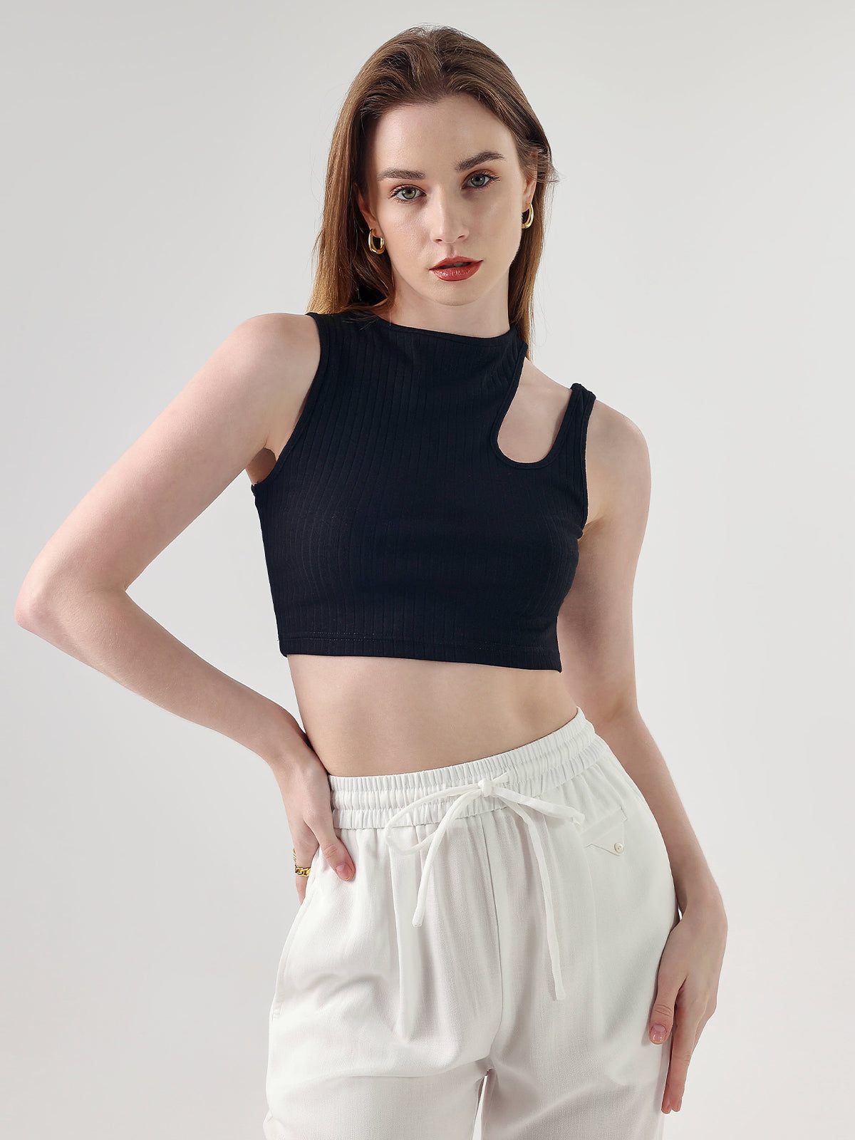 This is a cropped tank with rib-knit and shoulder cutouts. It’s made with cotton – skin-friendly & polyester – good resilience & spandex – stretchable. Be sunshine, be hot.