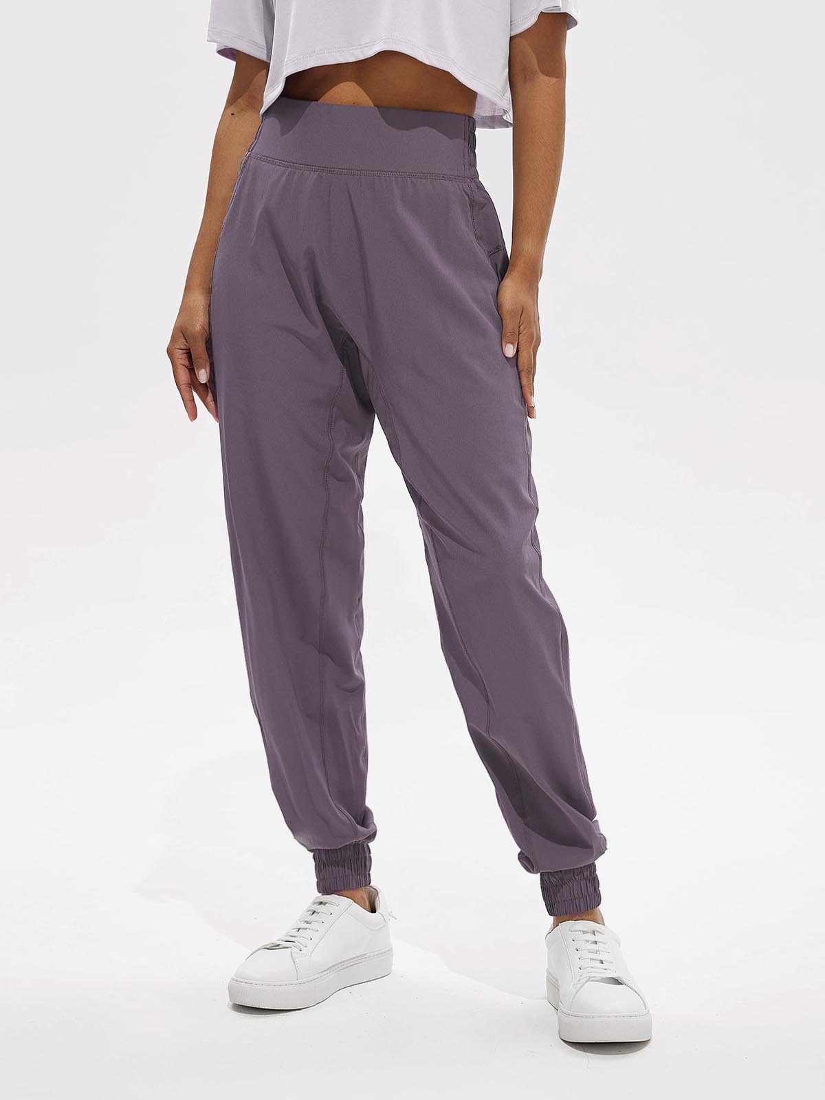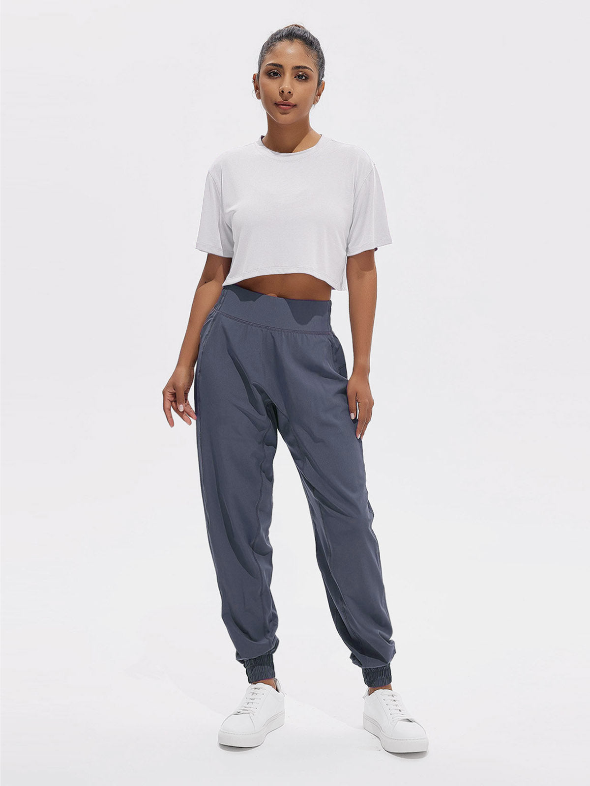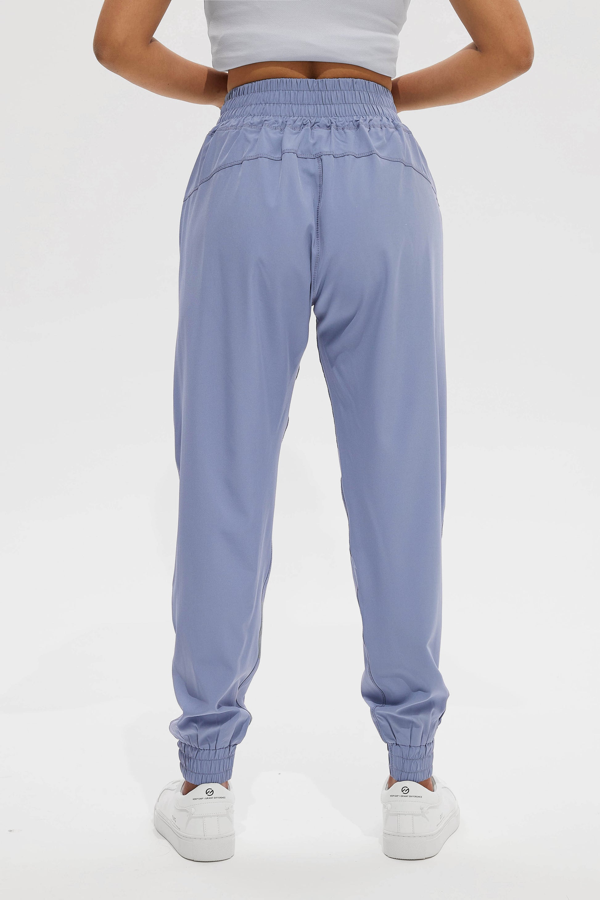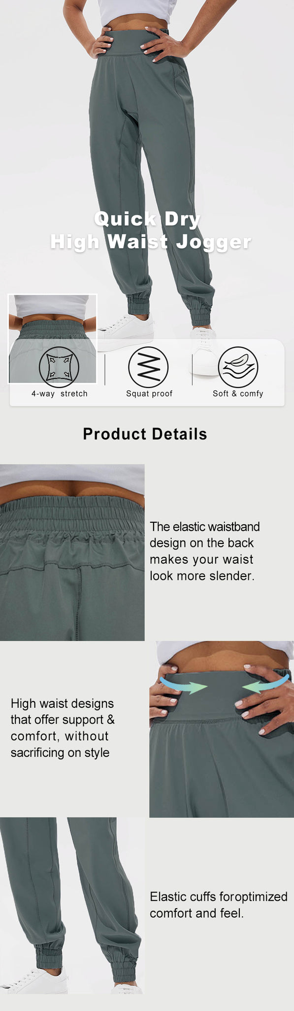 This is a pair of quick dry high waist joggers with an elastic band. It's made with stretchy and breathable fabric. Make sure to feel comfortable throughout your workout and throughout the day.