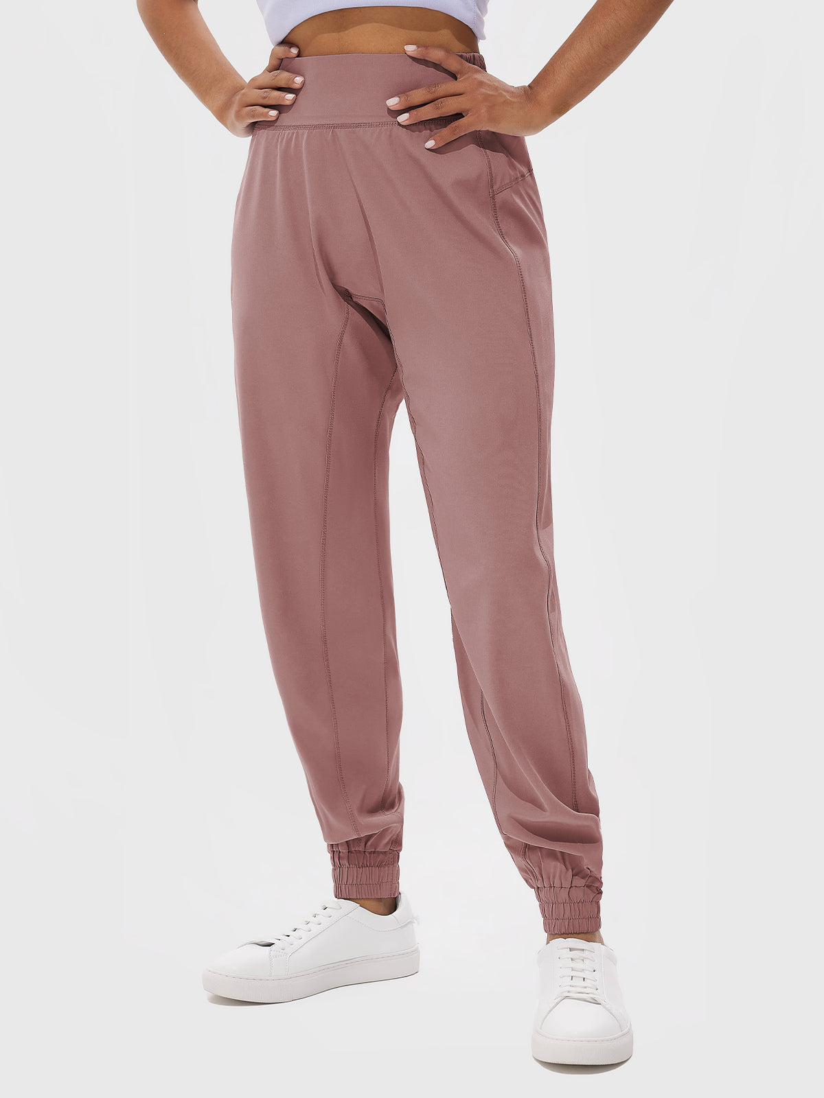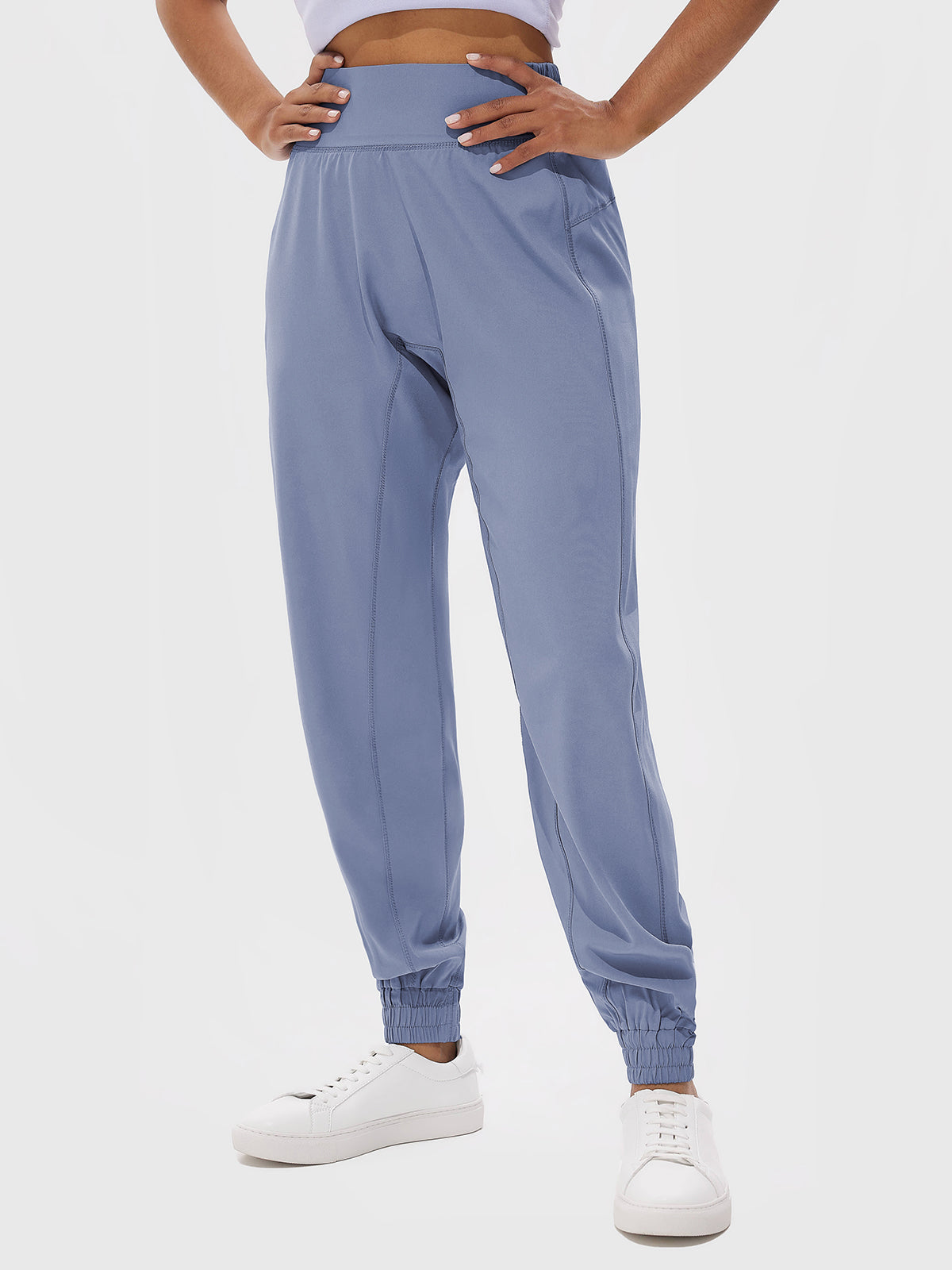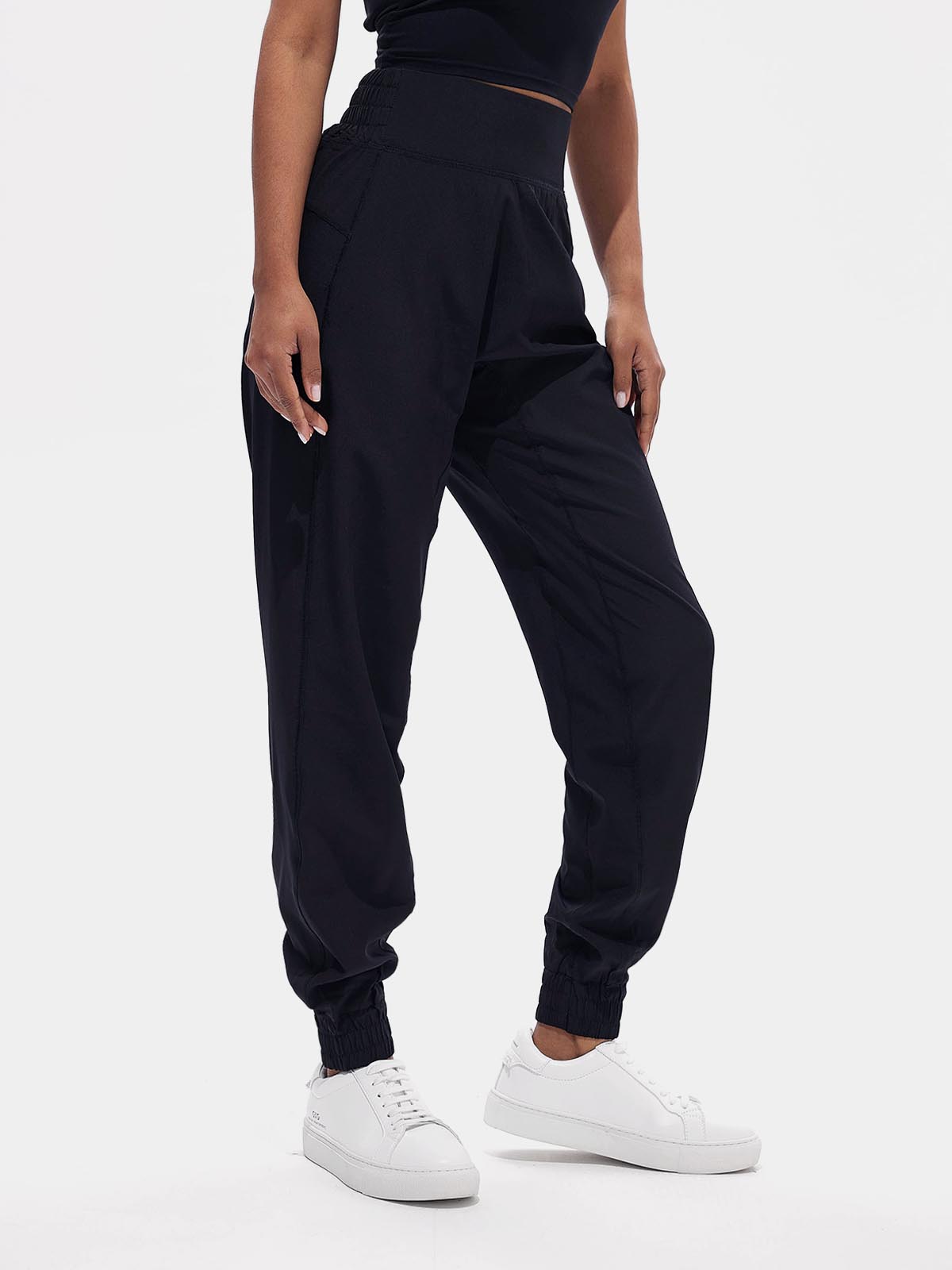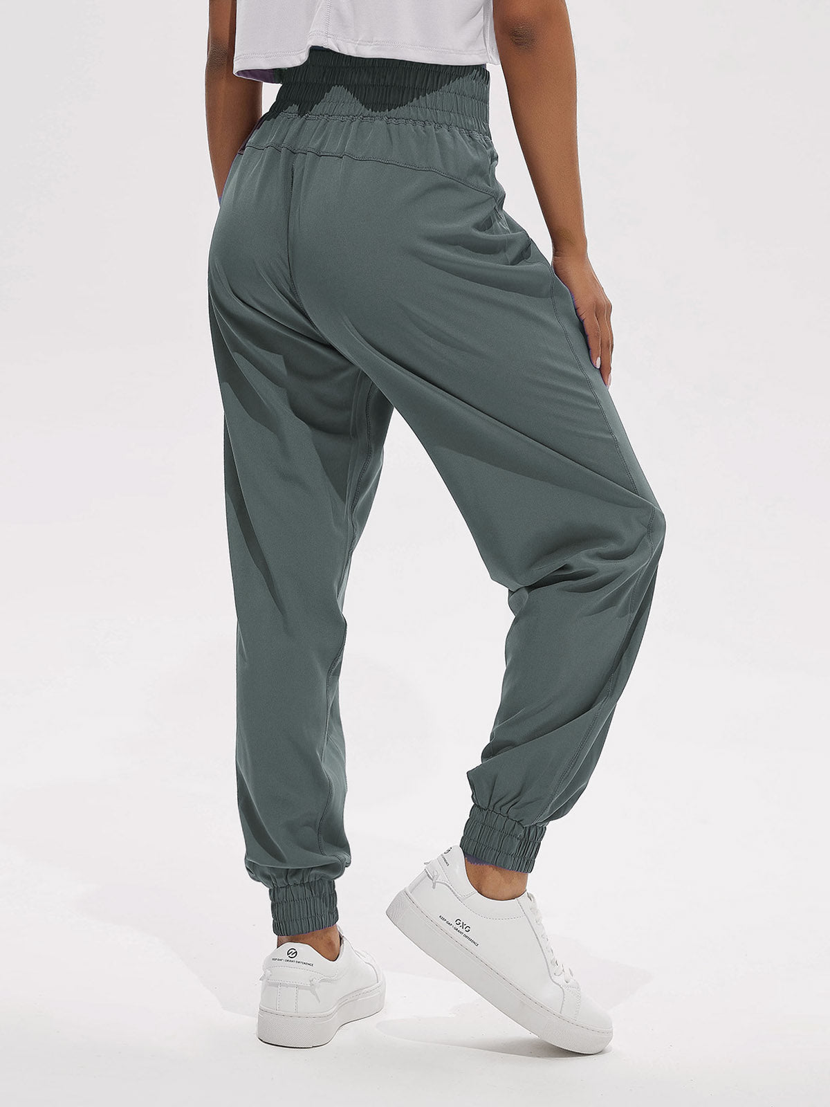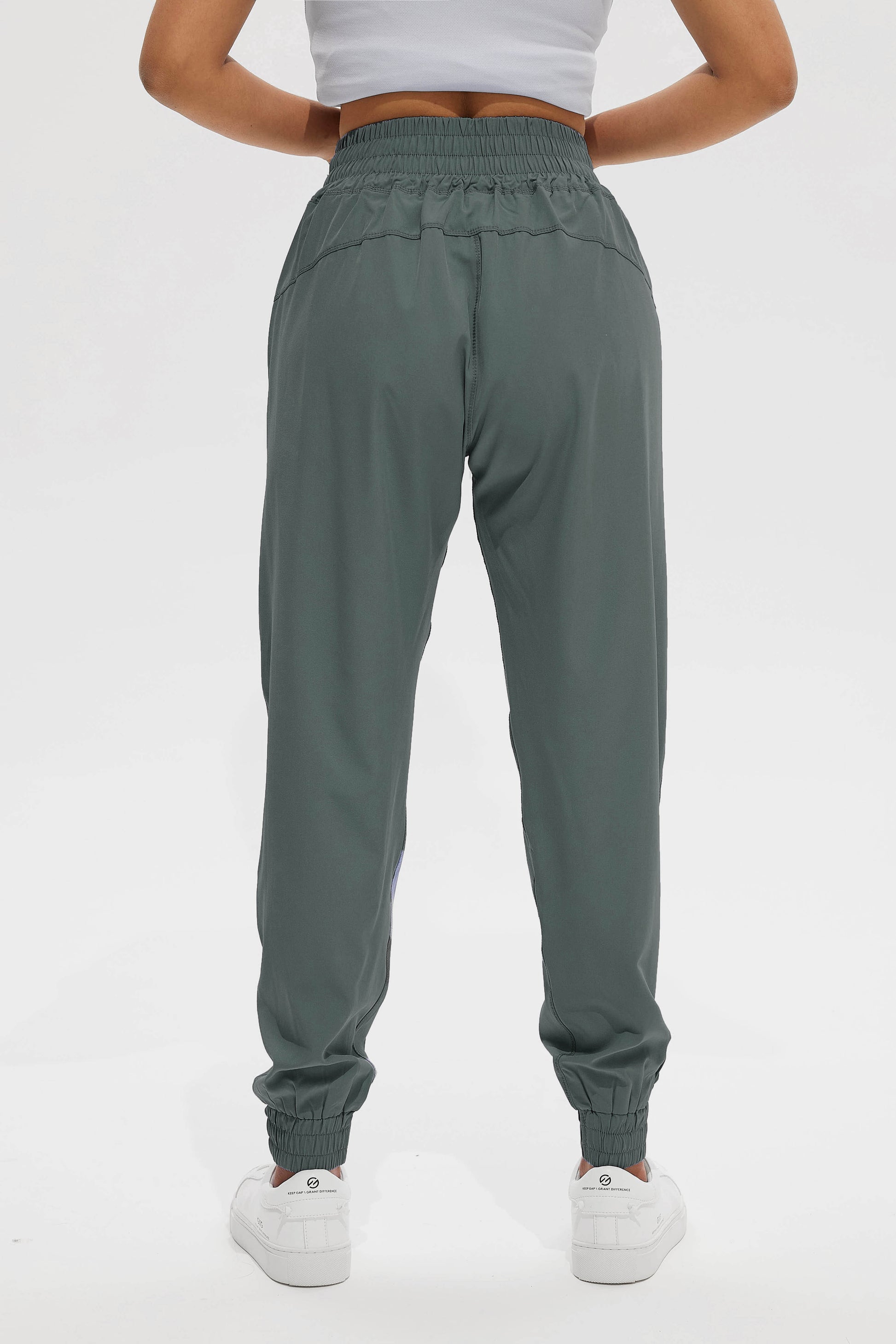 This is a pair of quick dry high waist joggers with an elastic band. It's made with stretchy and breathable fabric. Make sure to feel comfortable throughout your workout and throughout the day.